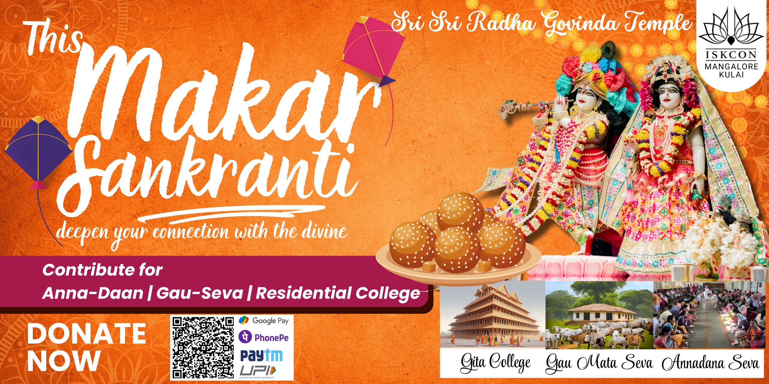 Offering service to Shri Krishna is the core celebration of Makar Sankranti. Vaishnava teachings clarify that service cleanses heart and uplifts the soul. Devotees of Sri Sri Radha Govinda express their service by chanting the holy names, preparing for prasadam, donating for spiritual programs. Contributing to temple services through ISKCON donation helps continue educational and spiritual activities.Many devotees also ask how to support ISKCON Mangalore temple. This is the selfless contribution converts simple service into eternal devotion and adds everlasting peace. Support us by contributing towards Annadana, Gauseva and Upcoming Bhagavad Gita Residential College.